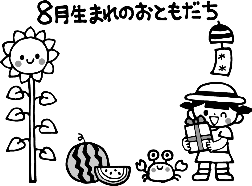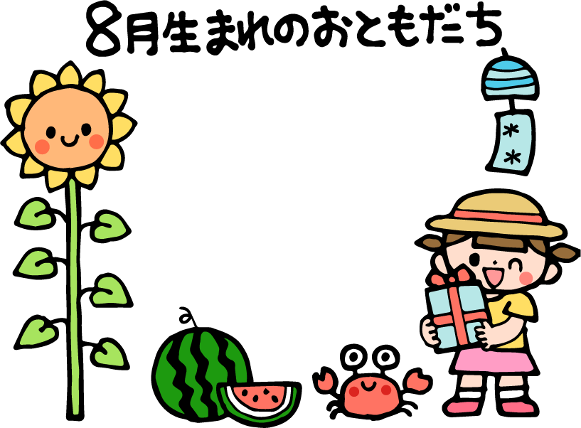 8月生まれのおともだち 8月生まれのお友達 誕生日 お誕生日 かに カニ 蟹 すいか スイカ 食べ物 果物 女の子 帽子 麦わら帽子 ふうりん 風鈴 ひまわり 向日葵 ヒマワリ 花 夏フレーム プレゼント