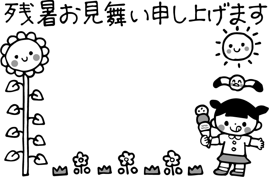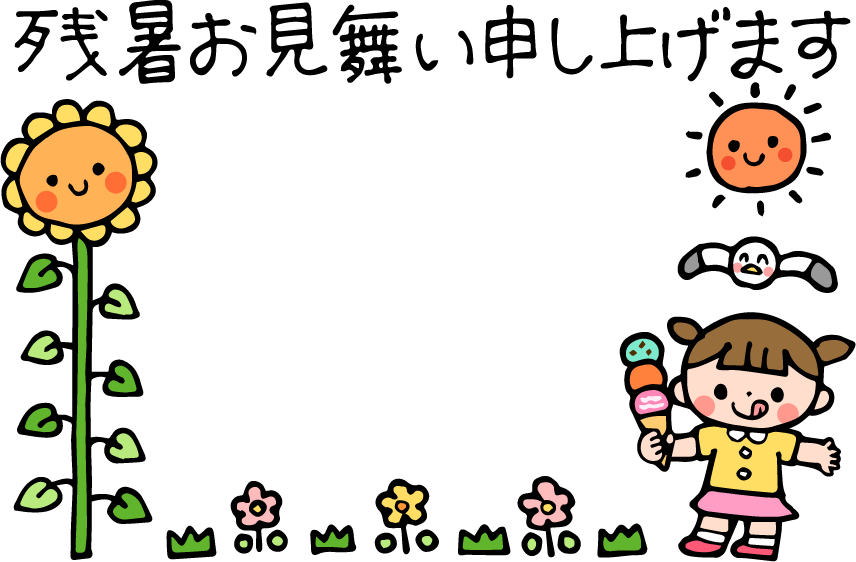 残暑お見舞い申し上げます 残暑見舞い申し上げます 残暑見舞い 女の子 アイス アイスクリーム 花 草 ひまわり ヒマワリ 太陽 鳥 かもめ カモメ