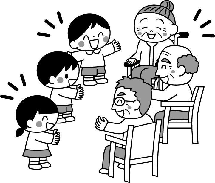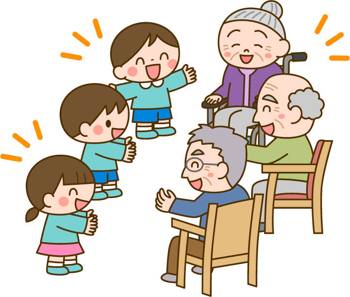 介護施設 デイサービス 老人ホーム お年寄り 老人 高齢者 女性 おばあさん おばあちゃん 男性 おじいさん おじいちゃん いす イス 椅子 車イス 車いす 車椅子 レク レクリエーション 幼稚園 園児 男の子 女の子 交流