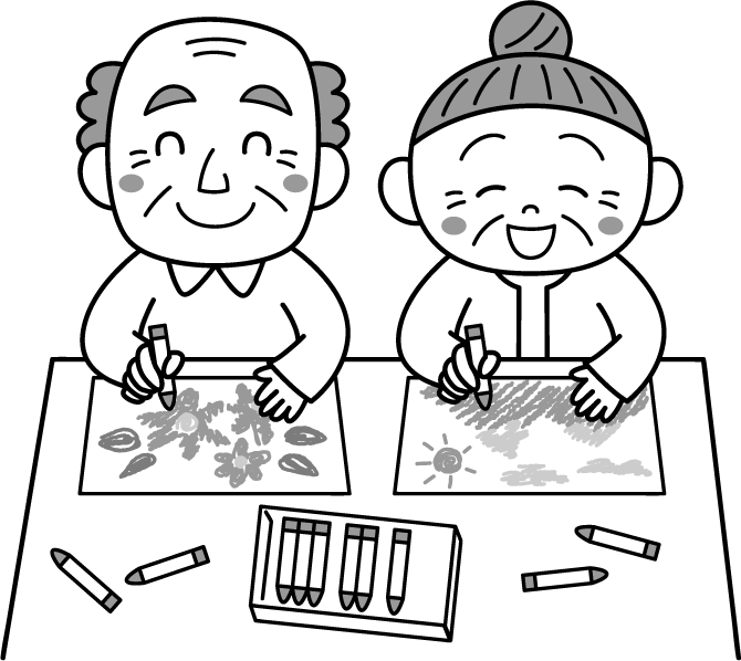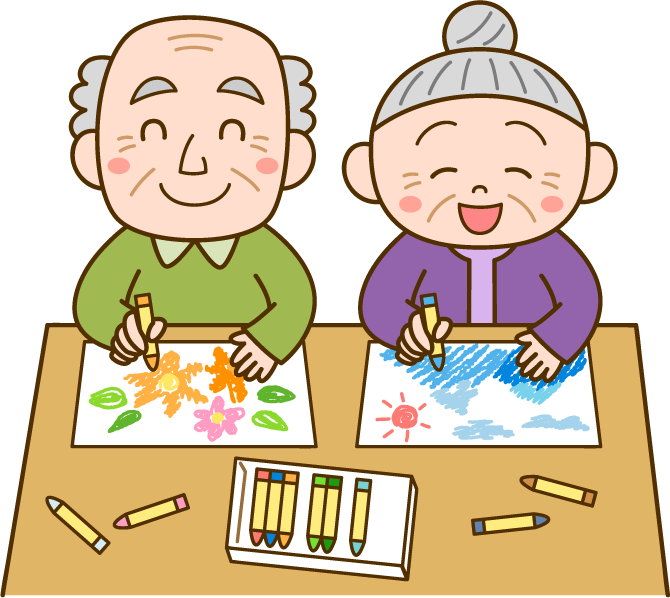 介護施設 デイサービス 老人ホーム お年寄り 老人 高齢者 女性 おばあさん おばあちゃん 男性 おじいさん おじいちゃん レク レクリエーション お絵描き お絵かき 絵 イラスト クレヨン 画材 図工