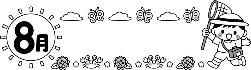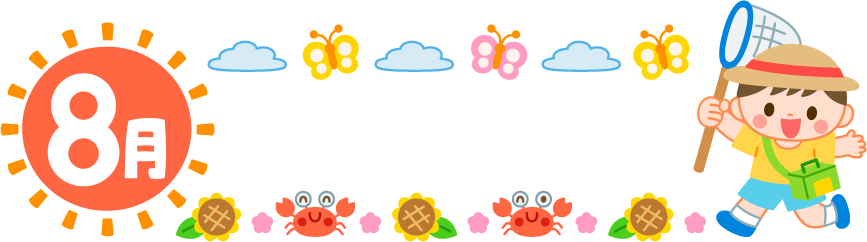 8月 8月 園だより 太陽 雲 晴れ 天気 くも ちょうちょ チョウチョ 蝶 虫取り 虫取りかご 虫取り網 園児 子ども こども 男の子 かに 蟹 カニ 花 ひまわり ヒマワリ 向日葵 帽子