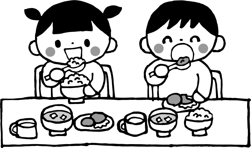 ごはん ご飯 食育 給食 食事 食べ物 料理 ハンバーグ レタス 野菜 味噌汁 米 お米 園児 男の子 女の子 子ども こども 食器 ともだち なかよし