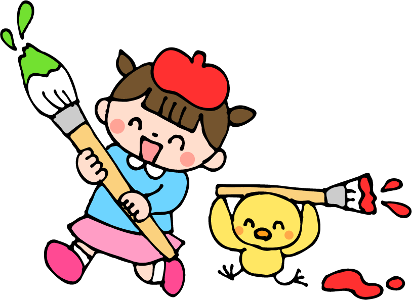 芸術の秋 絵具 画材 絵 お絵かき 筆 絵筆 画家 女の子 子ども 動物 ひよこ ヒヨコ 鳥