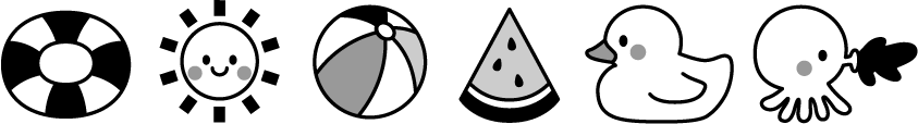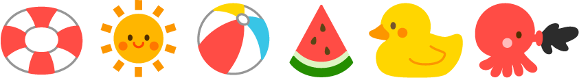 夏フレーム 浮き輪 うきわ 動物 鳥 アヒル あひる 食べ物 果物 フルーツ 西瓜 スイカ すいか ボール ビーチボール 天気 太陽 海の生き物 海 墨を吐く スミ すみ 墨 タコ たこ 園だより 保育園 幼稚園 こども園