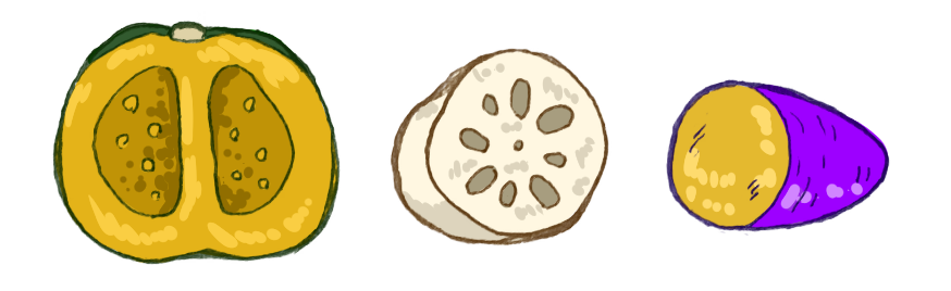 掲示板 園だより 食育 給食 食べる かぼちゃ カボチャ 南京 さつまいも サツマイモ さつま芋 レンコン れんこん 蓮根