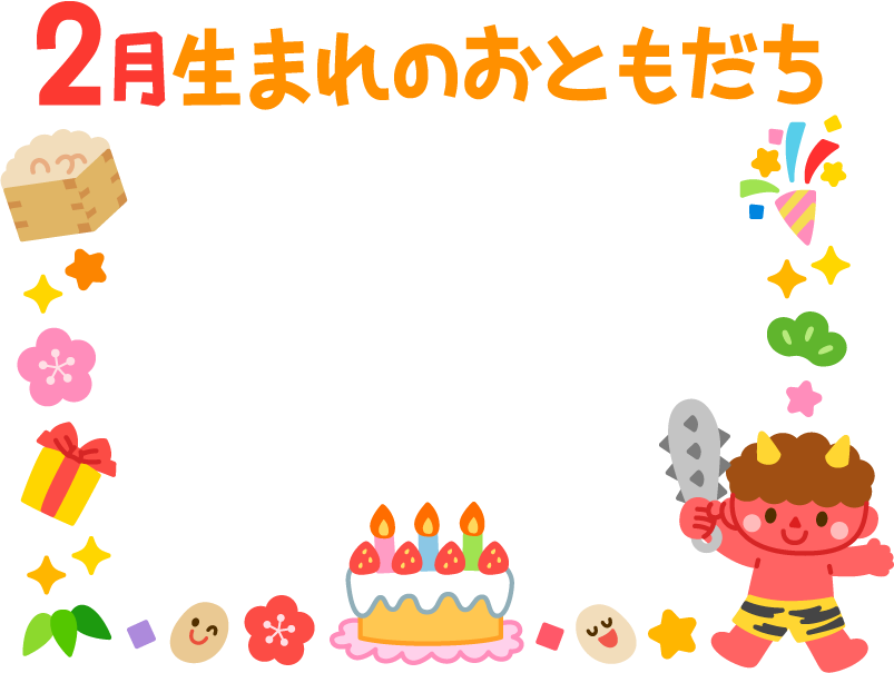 保育園 幼稚園 こども園 園だより お誕生日会 誕生日会 お誕生会 誕生会 お誕生日 誕生日 誕生日ケーキ クラッカー プレゼント 星 キラキラ 2月生まれのお友達 2月生まれのおともだち 2月 2月 節分 豆まき 金棒 鬼 赤鬼 おに オニ 豆 松 花 梅