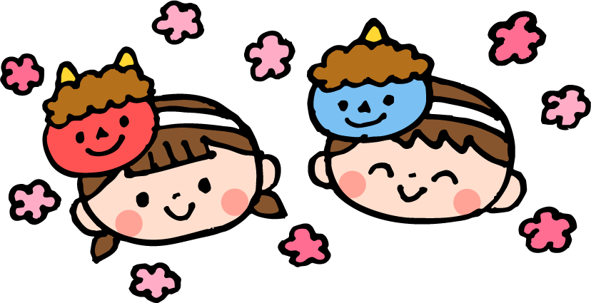 保育園 幼稚園 こども園 園だより えんだより 2月 2月 節分 おに オニ 鬼 赤鬼 青鬼 お面 鬼のお面 園児 こども 子ども 子供 女の子 男の子 花 冬のイベント