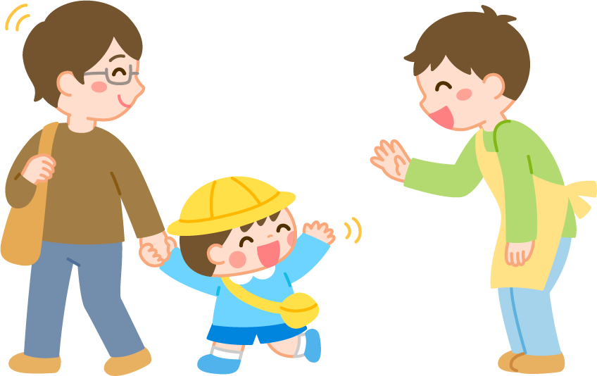 保育園 幼稚園 こども園 園だより えんだより 降園 先生 保育士 園児 男の子 こども 子ども 子供 ばいばい バイバイ さようなら 男性 保護者 おとうさん お父さん 父親 親子 お迎え あいさつ 挨拶 リクエスト