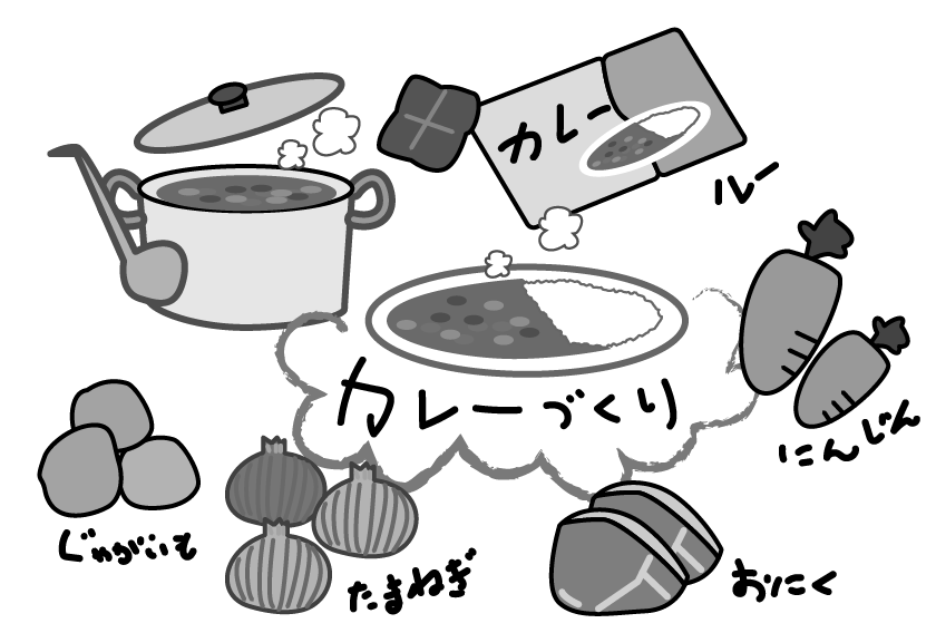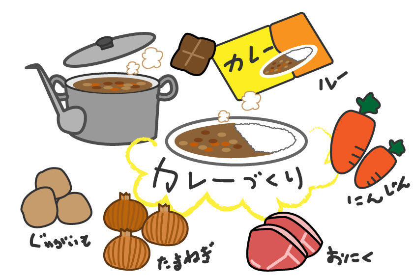 カレー カレー材料 キャンプ キャンプ飯 飯盒炊飯 えんだより お便り 手紙 給食だより 食育 たまねぎ にんじん じゃがいも お肉 カレールー 料理 リクエスト