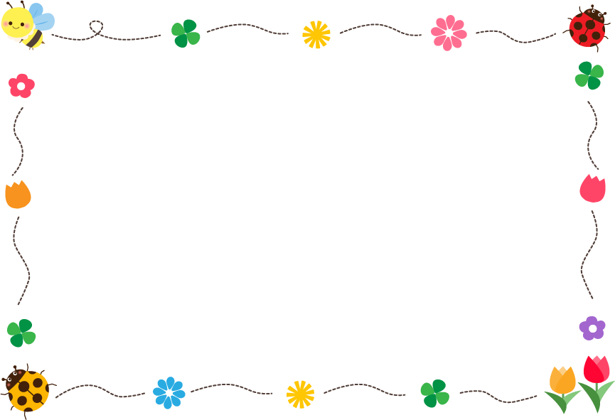 メッセージ 園だより 手紙 カード 春フレーム お知らせ はな 花 葉っぱ はっぱ よつば 四つ葉 クローバー ハチ はち 蜂 みつばち ミツバチ テントウムシ てんとうむし チューリップ タンポポ たんぽぽ リクエスト
