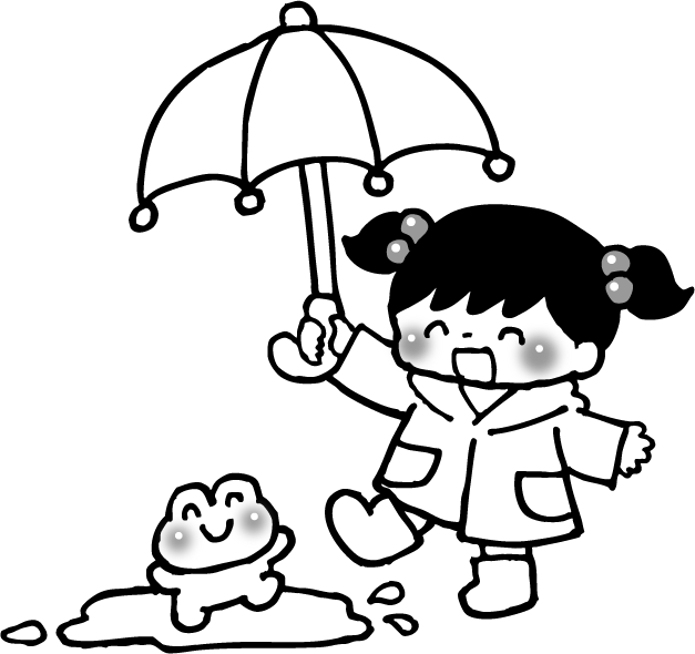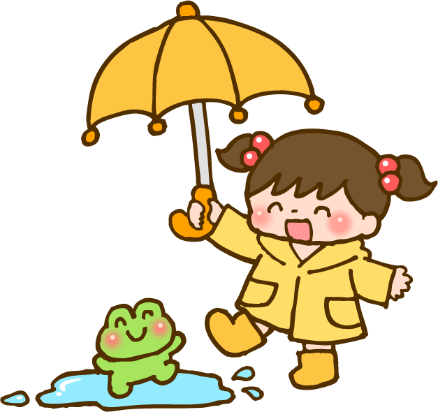 保育園 幼稚園 こども園 園だより えんだより 梅雨 かえる カエル あめ 雨 かさ カサ 傘 カッパ 園児 こども 子ども 子供 女の子 水たまり 水溜まり