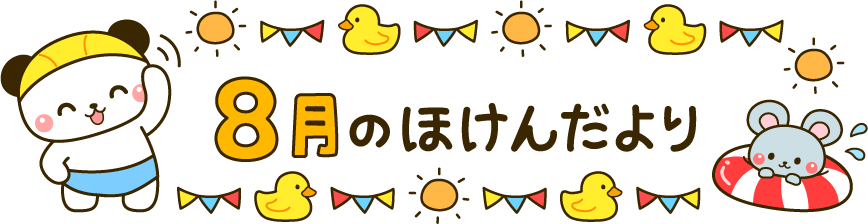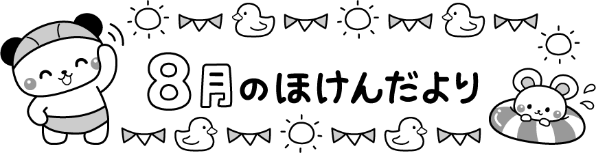 保育園 幼稚園 こども園 園だより えんだより タイトル ほけんだより 保健だより 保健 8月 8月 プール うきわ 浮き輪 浮輪 水着 太陽 あひる アヒル とり トリ 鳥 動物 ぱんだ パンダ ねずみ ネズミ 鼠 水泳 旗 フラッグ