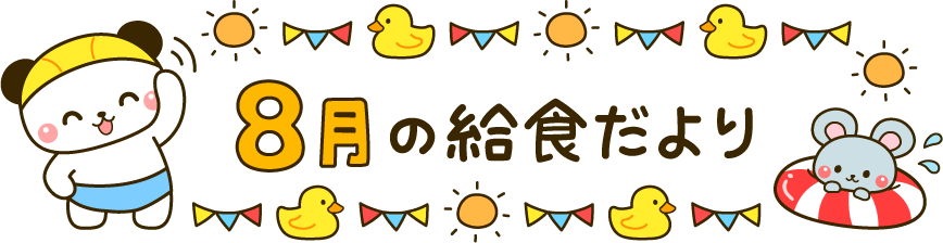 保育園 幼稚園 こども園 園だより えんだより タイトル きゅうしょくだより 給食だより 給食 食育 8月 8月 プール うきわ 浮き輪 浮輪 水着 太陽 あひる アヒル とり トリ 鳥 動物 ぱんだ パンダ ねずみ ネズミ 鼠 水泳 旗 フラッグ