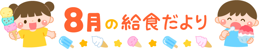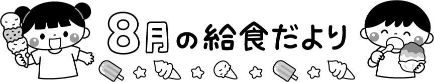 保育園 幼稚園 こども園 園だより えんだより タイトル 8月 8月 きゅうしょくだより 給食だより 給育 園児 こども 子ども 子供 男の子 女の子 食べ物 デザート スイーツ アイスクリーム アイス ソフトクリーム かき氷 カキ氷 屋台スイーツ