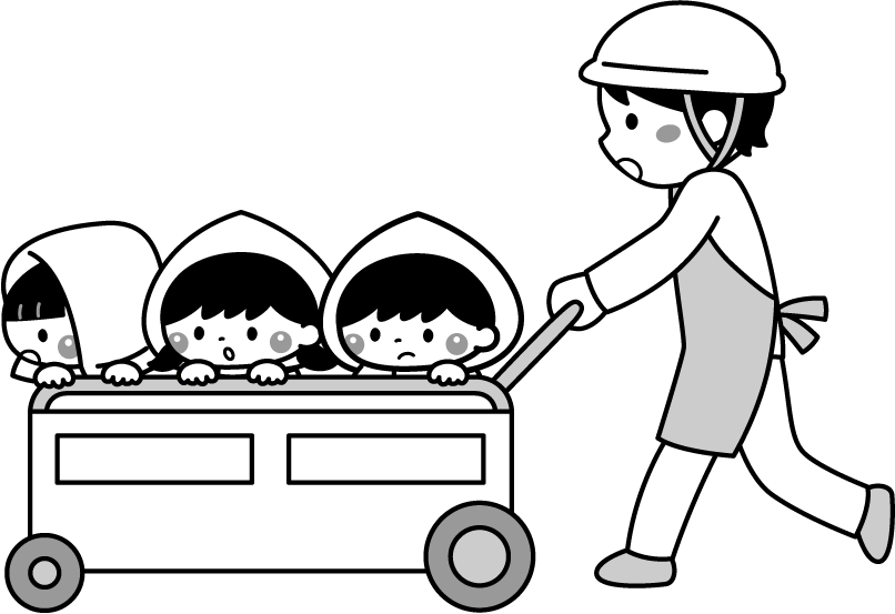 防災訓練 避難訓練 ベビーカート 乳母車 お散歩カート おさんぽカー 防災頭巾 避難 避難車 カート 保育園 幼稚園 こども園 園だより えんだより 園児 こども 子ども 子供 男の子 女の子 保育士 男性 防災の日 防災