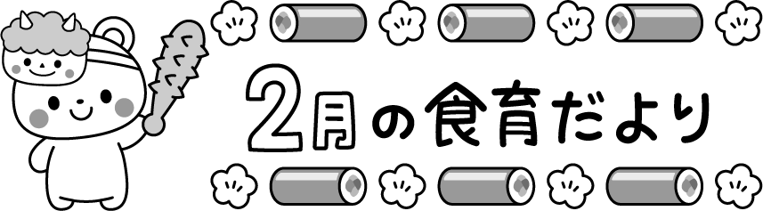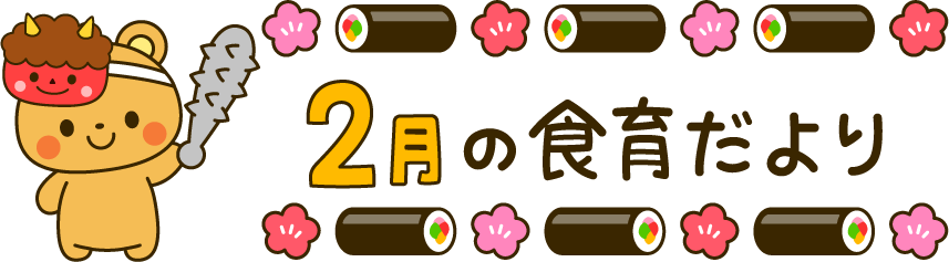 動物 熊 クマ くま お面 鬼 豆まき 節分 2月 2月 タイトル えんだより 園だより こども園 幼稚園 保育園 恵方巻 恵方巻き しょくいくだより 食育だより 給食 食育 料理 食べ物 お寿司 寿司 巻き寿司 梅 花 金棒